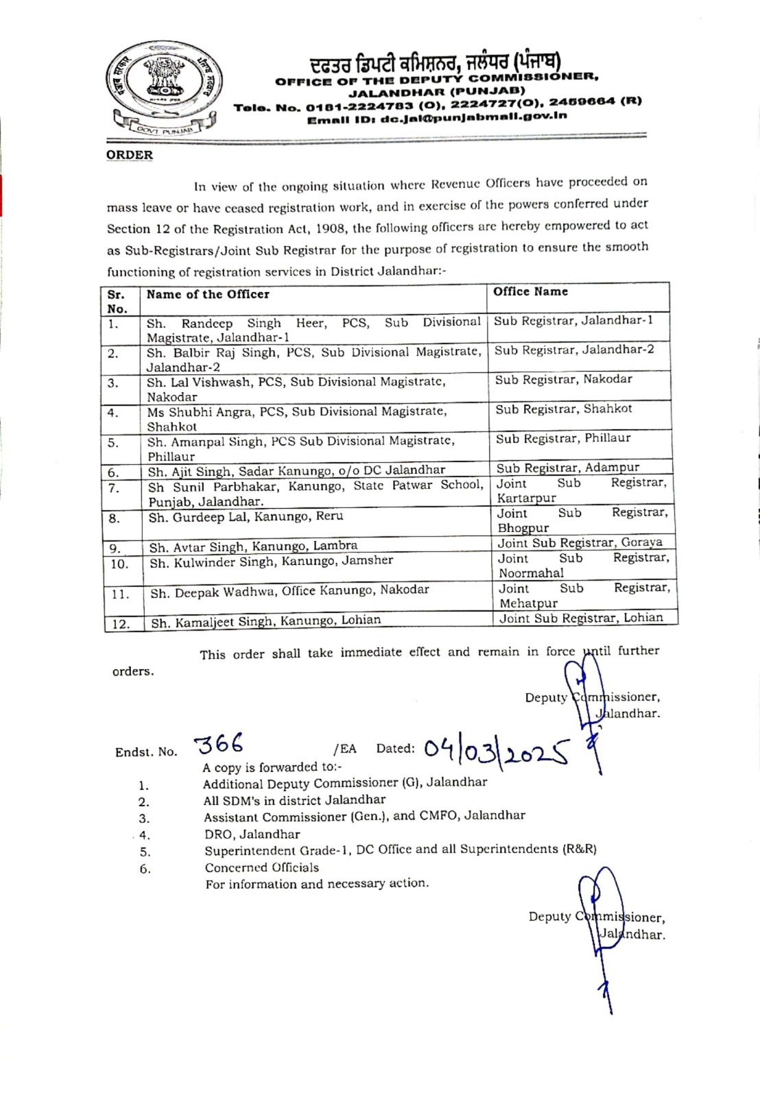 वहीं उन्होंने सभी जिलों की तहसीलों में काम ना बंद करने के आदेश जारी किए है। वहीं पंजाब सरकार ने राजस्व अधिकारियों की हड़ताल से निपटने के लिए बड़ा फैसला लिया है। राजपत्रित अधिकारियों तहसीलदार के स्थान पर एसडीएम और कानूनगो रजिस्ट्री करेंगे। वहीं, जालंधर के DC हिमांशु अग्रवाल व रोपड़ के DC Himanshu Jain ने अधिकारियों को रजिस्ट्रियां करने के अधिकार सौंपे हैं। उन्होंने कहा कि तहसील में लोगों की राजिस्ट्रियों का काम नहीं रोका जाएगा। जिनकी नीचे दी गई सूची निम्न है।
