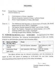 जालंधर : पंजाब सरकार द्वारा लगातार पुलिस अधिकारियों के तबादले किए जा रहे हैं। वहीं जारी तबादलों के मुताबिक जालंधर के एसीपी निर्मल सिंह का एसबीएस नगर मोहाली में तबादला किया गया। दूसरी और मोहाली के अमनदीप सिंह को जालंधर में तैनात किया गया।