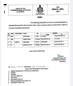 जालंधर : भारत-पाक में तनाव की स्थिति के बीच पुलिस कमिश्नर धनप्रीत कौर की अगुवाई में तीन थानों के एसएचओ सहित चार पुलिस अधिकारियों के तबादला किए गए। जारी सूची के मुताबिक पीएस साइबर के अनिल कुमार को थाना तीन में तैनात किया गया।