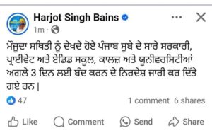 शिक्षा मंत्री ने लिखा,” मौजूदा स्थिति को देखते हुए पंजाब राज्य के सभी सरकारी प्राईवेट और एडिड स्कूलों, कॉलेजों और यूनिवर्सिटी अगले 3 दिन के लिए बंद करने के निर्देश जारी किए है।