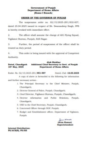 पंजाब सरकार ने पीपीएस स्वर्णदीप सिंह का निलंबन तत्काल प्रभाव से बहाल कर दिया है। एआईजी फ्लाइंग स्क्वायड, विजिलेंस ब्यूरो पंजाब का कार्यभार संभालेंगे। निलंबन की अवधि को ड्यूटी समय माना जाएगा।