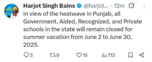 चंडीगढ़- पंजाब के शिक्षा मंत्री हरजोत सिंह बैंस ने ट्वीट कर पंजाब के सभी सरकारी और निजी स्कूलों में छुटियों का ऐलान कर दिया है। उन्होंने कहा कि गर्मियों की छुटियाँ 2 जून से 30 जून तक होंगी।