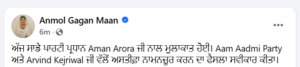 पंजाब आप पार्टी के प्रधान अमन अरोड़ा ने एक पोस्ट शेयर की है। इस पोस्ट में उन्होंने बताया कि आज अनमोल गगन मान से पारिवारिक माहौल में बात हुई। उन्होंने लिखा कि पार्टी ने विधायक पद से उनका इस्तीफा स्वीकार न करने का ऐलान किया है। इसे उन्होंने स्वीकार किया है। पार्टी ने अनमोल गगन मान को मिलकर पार्टी और हलके की प्रगति के लिए काम करते रहेंगे। उन्होंने बताया कि वह परिवार का हिस्सा थी और बनी रहेगी।