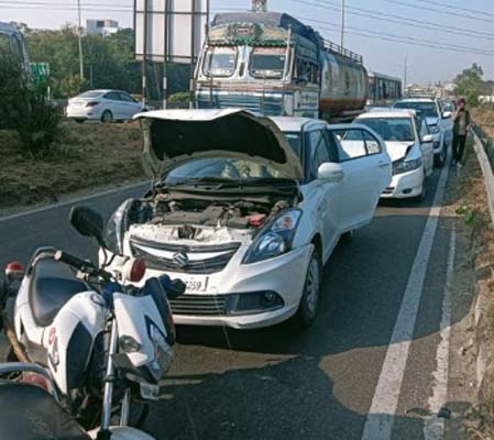 (PKL): चोगिट्टी फ्लाईओवर पर ओवरस्पीड की वजह से एक के बाद एक चार वाहनों की टक्कर का मामला सामने आया है। वाहनों की टक्कर से वहां हाइवे पर लंबा जाम लग गया। हादसे में करनी बीएमडब्ल्यू, स्विफ्ट डिजायर, होंडा सिटी और फार्च्यूनर गाड़ियों की टक्कर हुई। गाड़ियों का खासा नुकसान होने को लेकर सभी वाहन चालक एक दूसरे पर गलत गाड़ी चलाने का आरोप लगाकर हाइवे पर उलझते हुए दिखाई दिए। जिसके चलते चोगिट्टी फ्लाईओवर से पठानकोट चौक तक हाईवे के दोनों ओर लंबा जाम लग गया। मामले की सूचना मिलते ही पीसीआर व थाना रामामंडी की पुलिस मौके पर पहुंची। पुलिस ने हादसे का शिकार हुए वाहनों को हटवाकर जाम खुलवाना शुरू किया।