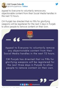 (PKL): पंजाब में पिछले कुछ दिनों से गन कल्चर को लेकर पुलिस द्वारा कई मामले दर्ज किए जा रहे हैं लेकिन अब इस बीच बड़ी खबर सामने आ रही है कि अब पंजाब में अगले तीन दिनों तक गन कल्चर को लेकर कोई भी एफआईआर दर्ज नहीं की जाएगी। मुख्यमंत्री भगवंत मान ने लोगों से अपील करते हुए कहा कि वह 72 घंटों में सोशल मीडिया पर डाली आपत्तिजनक सामग्री खुद ही हटा दें। इसकी जानकारी खुद डीजीपी गौरव यादव ने ट्वीट कर इसकी जानकारी दी। उन्होंने लिखा सभी से अपील है कि अगले 72 घंटों में स्वेच्छा से अपने सोशल मीडिया हैंडल से किसी भी आपत्तिजनक सामग्री को हटा दें।