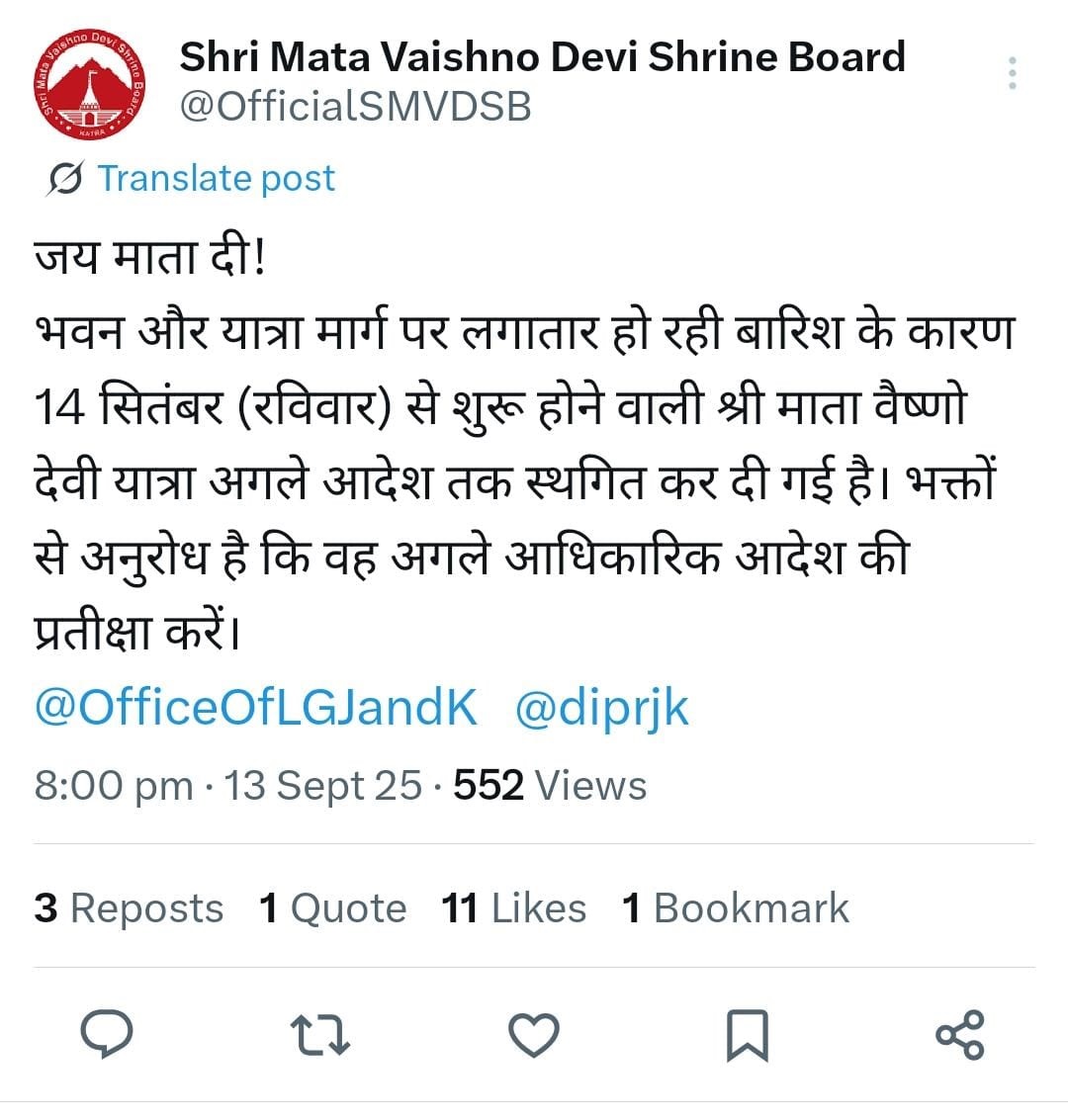 श्री माता वैष्णो देवी श्राइन बोर्ड ने सोशल मीडिया प्लेटफ़ॉर्म X (पहले ट्विटर) पर इसकी जानकारी दी। श्राइन बोर्ड ने बताया कि भवन और यात्रा मार्ग पर लगातार बारिश होने के कारण 14 सितंबर (रविवार) से शुरू होने वाली यात्रा को अगले आदेश तक स्थगित कर दिया गया है। बोर्ड ने श्रद्धालुओं से अपील की है कि वे धैर्य रखें और यात्रा की तैयारियों में जल्दबाजी न करें।