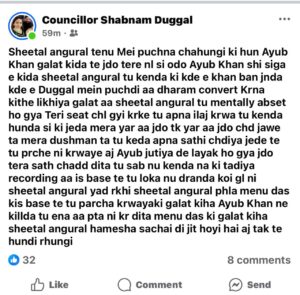 उन्होंने लिखा- शीतल अंगुराल तेनु मैं पूछना चाहूंगी कि हुन अयूब खान गलत किदा, ते जदो तेरे नाल सी ओदो अयूब खान सही सिगा, ए किदा शीतल अंगुराल। तू केंदा कि कदे ए खान बन जंदा कदे ए दुग्गल। शबनम ने कहा – मैं मेनू पूछदी आ धर्म कन्वर्ट करना कहां लिखा गलत है। शबनम ने आगे लिखा – शीतल अंगुराल तू मानसिक रूप से परेशान हो गया, तेरी सीट चल गई करके, तू अपना इलाज करवा। तू केंदा हुंदा सी कि जेडा मेरा यार आ, जदो तक यार आ जदो चद जावे ता मेरा दुश्मन, तां तू केडा अपना साथी छडिया जिसते तू पर्चे नी करवाएं।