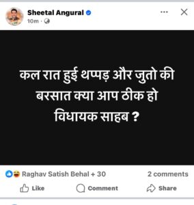 दरअसल, पूर्व विधायक ने पोस्ट में लिखा है कि कल रात थप्पड़ और जूतों की बरसात हुई है। वहीं आगे शीतल अंगुराल ने लिखा कि क्या विधायक साहब आप ठीक हो। इस पोस्ट को लेकर राजनीतिक गलियारें में हड़कंप मच गया है।