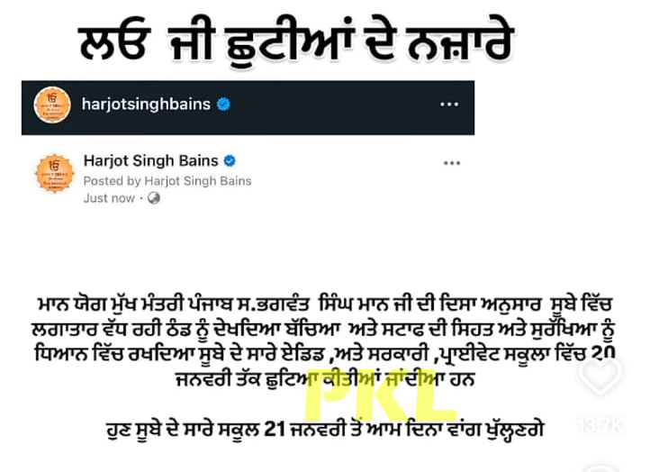 पंजाब में घने कोहरे और शीत लहर का कहर जारी है। मौसम विभाग के अनुसार भी 20 जनवरी तक ठंड से राहत मिलने की संभावना नहीं है। दूसरी ओर बीते दिन से स्कूल खुल गए है। हालांकि छुट्टियां खत्म होने पर स्कूल खुलने पर बच्चों की उपस्थिति कम रही। वहीं दूसरी ओर शिक्षा मंत्री हरजोत बैंस की एक पोस्ट सोशल मीडिया पर काफी वायरल हो रही है, जिसमें 21 जनवरी तक छुट्टियों को आदेश जारी किए गए है। हालांकि इसकी जब जांच की गई तो पाया गया कि यह फेक पोस्ट है, जो कि जट्ट_एडिट्ज_13 नाम के शख्स द्वारा पोस्ट की गई है। सरकार की ओर से छुट्टियां बढ़ाने को लेकर कोई नए आदेश जारी नहीं किए गए है।