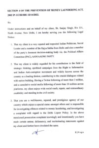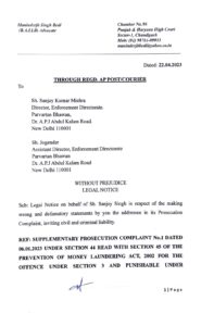 (PKL): आम आदमी पार्टी से सांसद संजय सिंह ने शनिवार को प्रवर्तन निदेशालय (ED) के अधिकारियों को मानहानि का नोटिस भिजवाया है। ये नोटिस ED के डायरेक्टर संजय कुमार मिश्रा और कथित आबकारी घोटाले मामले की जांच कर रहे जांच अधिकारी जोगेन्दर को भेजा गया है। संजय सिंह ने अधिकारियों से 48 घंटे के भीतर माफी मांगने, वरना कानूनी कार्रवाई के लिए तैयार रहने के लिए कहा है।