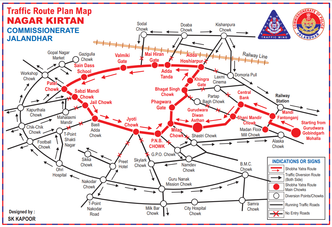 (PKL): जालंधर में गुरु नानक देव जी के 554 वें प्रकाश पर्व को लेकर 25 नवंबर को विशाल नगर कीर्तन निकाला जा रहा है। यह नगर कीर्तन गुरुद्वारा श्री गुरु सिंह सभा मोहल्ला गोबिंदगढ़ से आरंभ होकर एसडी कॉलेज, भारत सोडा फैक्टरी, मंडी फैंटरगंज रोड़, गुरुद्वारा श्री दीवान अस्थान सेंट्रल टाउन, मिलाप चौंक फगवाड़ा गेट, शहीद भगत सिंह चौंक, पंजपीर चौंक, खिंगरा गेट, गुरुद्वारा श्री सिंघ सभा अड्डा होशियारपुर, माईं हीरा गेट, भगवान वाल्मीकि गेट, ज्योति चौंक (श्री राम चौंक), रैणक बाजार, मिलाप चौंक की ओर से होते हुए गुरुद्वारा श्री दीवान अस्थान सेंट्रल टाउन में पहुंचेगा। इस नगर कीर्तन में समूह संगत और लोगों का ध्यान रखते हुए कमिश्नरेट पुलिस ने सुबह 9 बजे से 10 बजे तक इस प्वाइंट चौंकों की आवाजाई को डायवर्ट किया है।