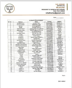 बीजेपी एससी (अनुसूचित जाति) मोर्चा के प्रदेश अध्यक्ष एसआर लधर ने बीजेपी प्रदेश अध्यक्ष सुनील जाखड़, केंद्रीय मंत्री मंथरी श्री निवासलु और एससी मोर्चा के प्रदेश प्रभारी और बीजेपी के प्रदेश महासचिव अनिल सरीन के साथ विचार-विमर्श के बाद 35) जिला प्रभारियों जिले को नियुक्त किया गया है।