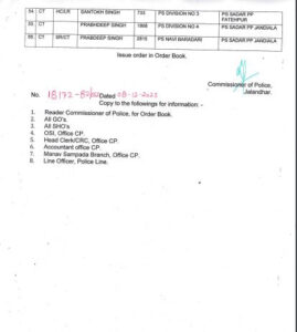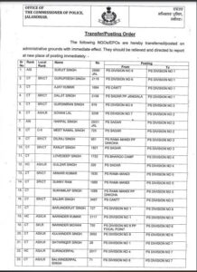जालंधर में 56 पुलिस कर्मियों के तबादले हुए हैं। देखें लिस्ट Post navigation जालंधर से अभी अभी बड़ी खबरः पुलिस कमिश्नर का एक्शन, थाने के SHO के खिलाफ किया मामला दर्ज लुधियाना से अभी अभी बड़ी खबरः स्कूल के बाहर स्टूडेंट्स में हुआ विवाद, हथियार लेकर पहुंचा एक गुट