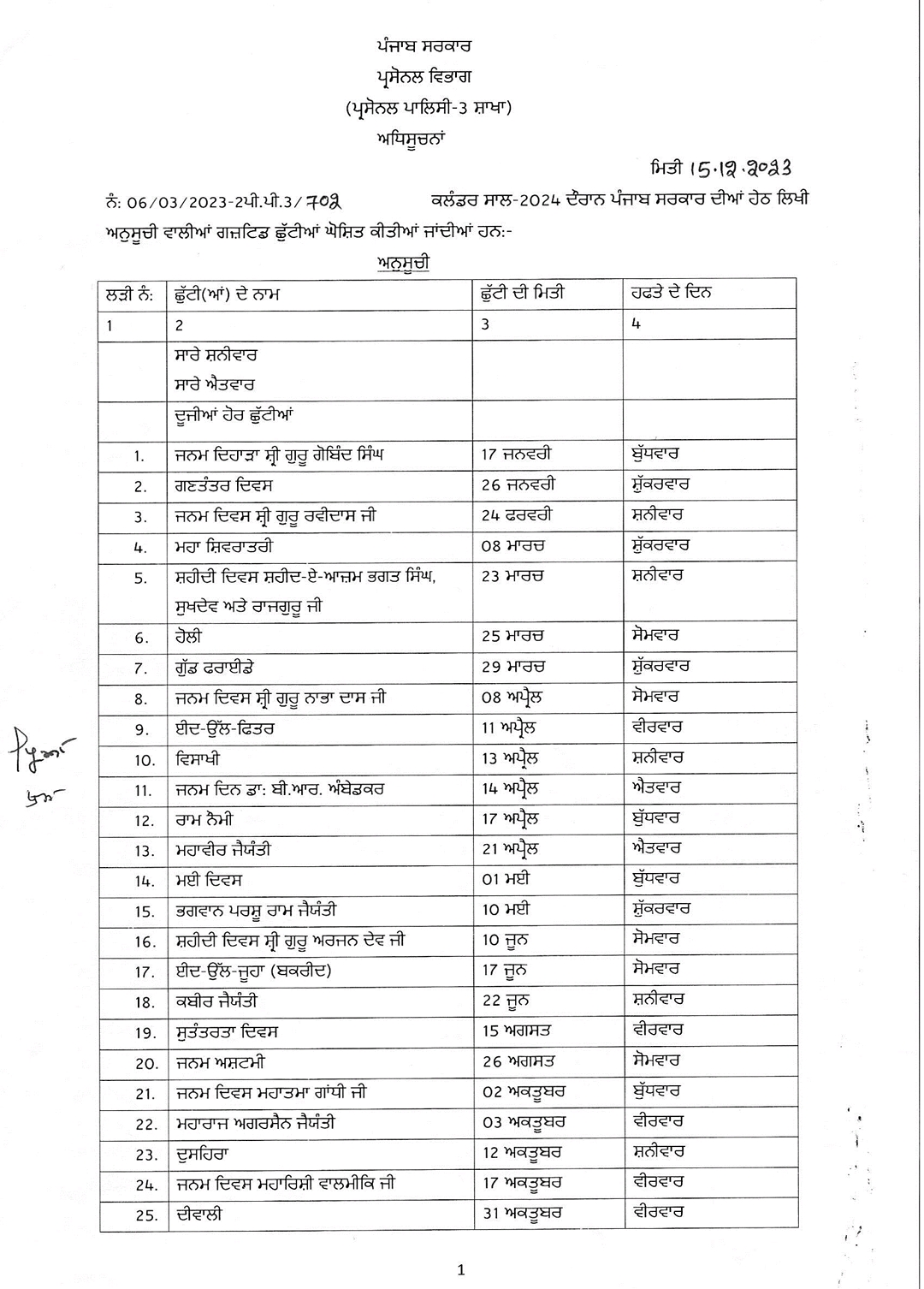 पंजाब सरकार द्वारा वर्ष 2024 के लिए गजटिड छुट्टियों की सूची जारी की गई है। सूचि इस प्रकार हैं- Post navigation पंजाब से बड़ी खबरः स्वास्थ्य अधिकारियों के हुए तबादले, डॉ जगदीप चावला को जालंधर का सिविल सर्जन किया नियुक्त, देखें लिस्ट जालंधर से अभी अभी बड़ी खबरः ढिल्लों ब्रदर्स सुसाइड केस में पूर्व इंस्पेक्टर नवदीप सिंह को मिली राहत