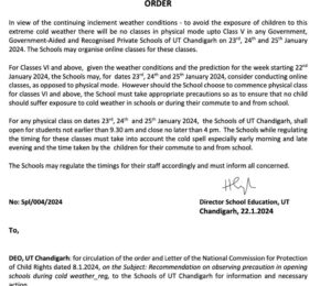 वहीं अन्य कक्षाएं सुबह साढे 9 बजे से पहले नहीं खुलेंगी। यह भी कहा गया है कि 6वीं कक्षा और इसके ऊपर की कक्षाओं के लिए मौसम की स्थितियों के मद्देनजर 2024 से शुरू होने वाले हफ्ते की भविष्यवाणी के मद्देनजर स्कूल 23, 24, 25 जनवरी 2024 के लिए फिजिकल मोड के उल्ट आनलाइन Classes करवाने बारे विचार कर सकते हैं। बता दें कि इससे पहले चंडीगढ़ में 8वीं कक्षा तक के सभी स्कूल 20 जनवरी तक बंद रखने के आदेश दिए गए थे।