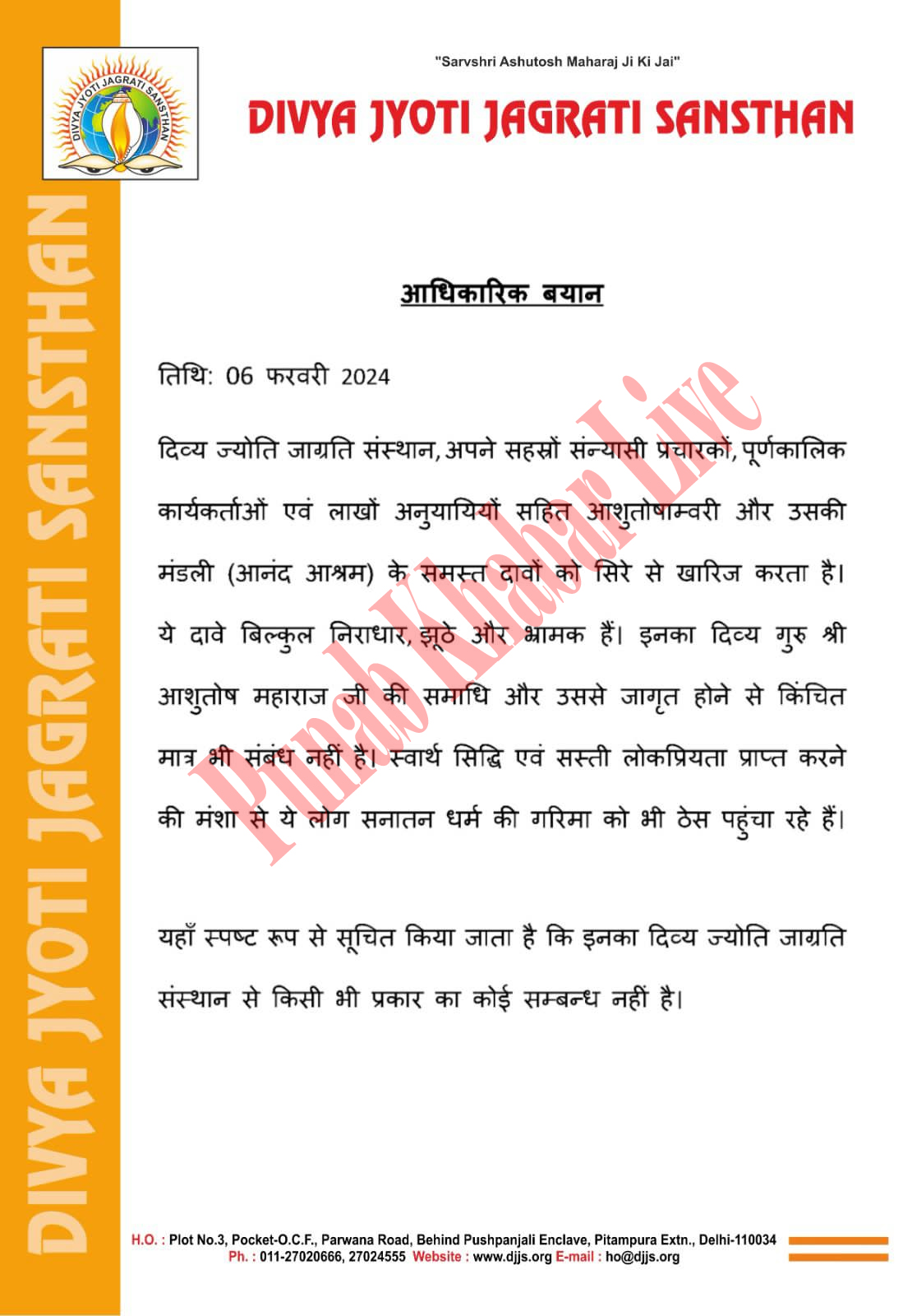 दूसरी ओर इस मामले को लेकर दिव्य ज्योति जागृति संस्था ने पत्र जारी किया है। जिसमें उन्होंने लिखा है कि आशुतोषाम्वरी और उसकी मंडली (आनंद आश्रम) के समस्त दावों को खारिज करती है। ये दावे बिल्कुल निराधार और भ्रमक है। इनका दिव्य गुरु आशुतोष महाराज की समाधि और उससे जागृत होने से किंचित मात्र भी संबंध नहीं है। स्वार्थ सिद्धि एवं सस्ती लोकप्रियता हासिल करने की मंशा से ये लोग सनातन धर्म की गरिमा को भी ठेस पहुंचा रहे है। उन्होंने जारी पत्र में स्पष्ट किया है कि इनका दिव्य ज्योति जागृति संस्थान से किसी भी प्रकार का कोई संबंध नहीं है।