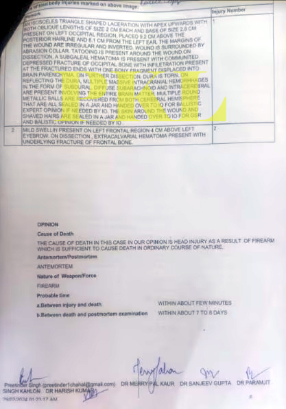 शंभु बॉर्डर पर 21 फरवरी 2024 को किसान शुभकरण की मौत हो गई थी। वहीं इस मामले को लेकर आज शुभकरण की पोस्टमार्टम रिपोर्ट सामने आई है। रिपोर्ट में दावा किया गया है कि शुभकरण की मौत बंदूक की चोट से हुई। क्योंकि उसके सिर से कई छर्रे मिले है जबकि रबर की गोली में यह नहीं होते। सूत्रों अनुसार शुभकरण के पोस्टमार्टम की रिपोर्ट में मौत का कारण गन इंजरी दर्शाया गया है। रिपोर्ट में यह भी जिक्र है कि उसके सिर में मिले छर्रे मेटल के है। रिपोर्ट यह भी दर्शती है कि मौत मौके पर ही हो गई थी। बता दें कि राजिंद्रा अस्पताल द्वारा पोस्टमार्टम रिपोर्ट छर्र सहित स्थानिय पुलिस को सौंप दी गई है।