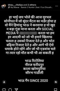 बताया जा रहा है कि शराब कारोबारी सुंदर मलिक नीतू दाबोदिया गैंग का शार्प शूटर था. सोनीपत के शराब व्यापारी सुंदर मलिक की हत्या की जिम्मेदारी भाऊ गैंग के सरगना हिमांशु रिटोली ने ली है. सोशल मीडिया पर पोस्ट कर हिमांशु रिटोली ने लिखा “सुंदर अपने आपको बड़ा बदमाश मानता था. इसलिए उसकी हत्या करवाई है. सुंदर सोशल मीडिया पर हमारे खिलाफ बोलता था. इसलिए उसकी हत्या हुई है.”