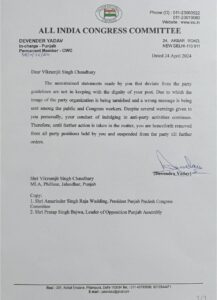 पूर्व सांसद चौधरी की पत्नी कर्मजीत कौर हाल ही में कांग्रेस छोड़कर भाजपा में शामिल हो गई। कर्मजीत कौर के भाजपा में शामिल होने के बाद बेटे बिक्रम चौधरी और चरणजीत चन्नी में जवानी जंग शुरू हो गई। जिसके बाद आज पंजाब के इंचार्ज देवेंद्र यादव ने फ्लोर से विधायक बिक्रम चौधरी पर एक्शन लेते हुए उन्हें पार्टी से सस्पेंड कर दिया है।