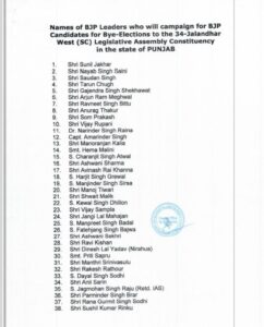 जालंधर के वेस्ट हलके में होने वाले उप चुनाव को लेकर BJP ने जारी की स्टार प्रचारकों की सूची, देखें लिस्ट