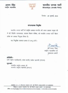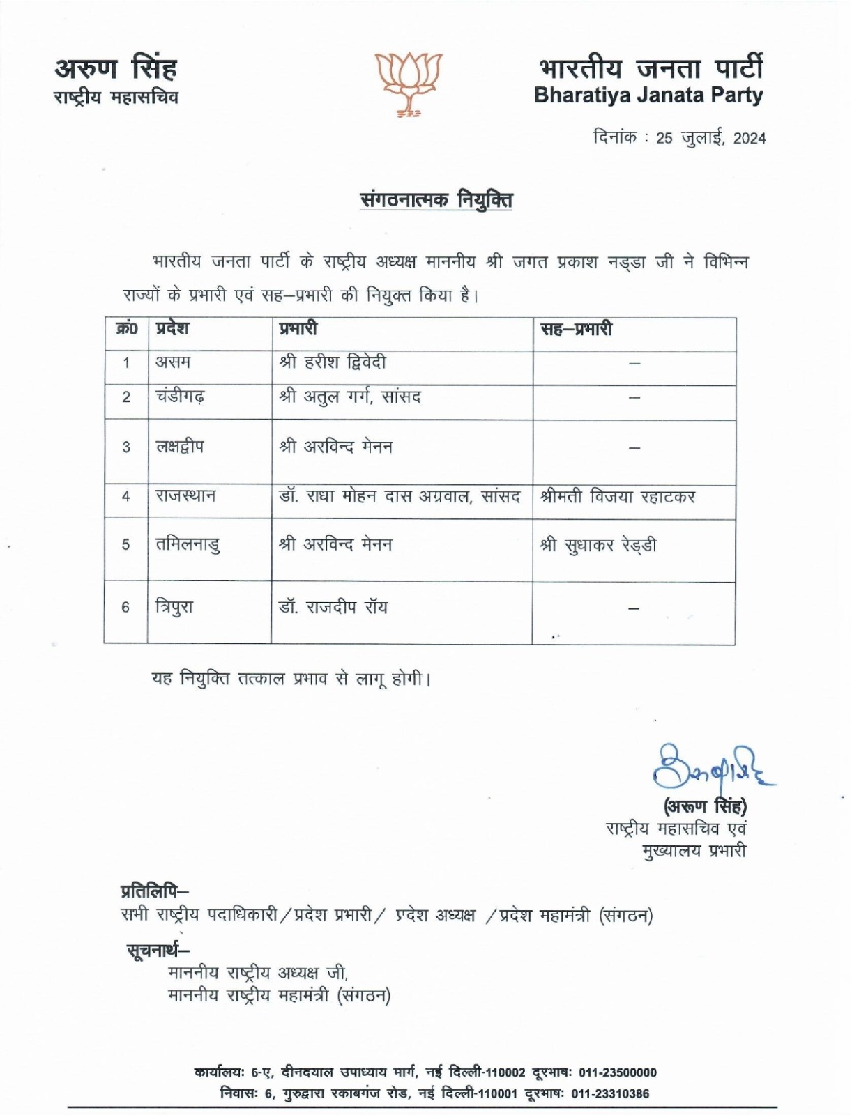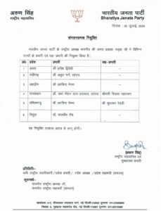 बीजेपी ने इसके साथ ही 6 राज्यों के प्रदेश प्रभारी भी बदल दिए हैं। पार्टी ने असम में हरीश द्विवेदी को नया प्रदेश प्रभारी नियुक्त किया है। चंडीगढ़ में अतुल गर्ग, लक्षद्वीप और तमिलनाडु में अरविंद मेनन, राजस्थान में राधा मोहन दास अग्रवाल और त्रिपुरा में डाॅ. राजदीप राॅय को नया प्रदेश अध्यक्ष नियुक्त किया है।