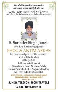 जुनेजा टेलीकॉम के मालिक विक्की जुनेजा के पिता सुरिंदर जुनेजा बीते दिन अपनी संसारिक यात्रा पूरी करके ईश्वर के चरणों में विलीन हो गए हैं। वह काफी समय से बीमार थे। विक्की जुनेजा के पिता की आत्मा की शांति के लिए अंतिम अरदास 30 जुलाई दिन मंगलवार को दोपहर 1 से 2 बजे तक गुरूद्वारा दुख निवारण साहिब नौवीं पातशाही, जीटीबी नगर, जालंधर में होगी।