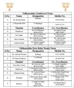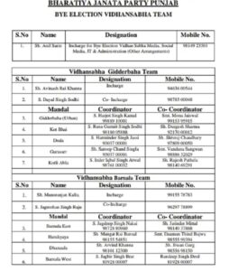 जबकि चब्बेवाल विधानसभा हलके की कमान श्ववेत मलिक को सौंपी गई है। वहीं, परमिंदर सिंह बराड़ को इंचार्ज लगाया गया है। डेरा बाबा नानक हलके का इंचार्ज अश्वनी शर्मा को लगाया गया है, राकेश राठौर को इंचार्ज बनाए गए है। अनील सरीन को सोशल मीडिया इंचार्ज लगाया है।