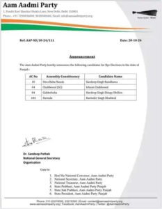 शपंजाब में 4 सीटों पर होने वाले उप-चुनावों की घोषणा के साथ ही आम आदमी पार्टी ने चारों सीटों के लिए अपने उम्मीदवारों की घोषणा कर दी है। आप द्वारा ज़ारी की गई लिस्ट के अनुसार डेरा बाबा नानक से गुरदीप सिंह रंधावा, चब्बेवाल से ईशान चब्बेवाल, गिद्दड़बाहा से हरदीप सिंह डिंपी ढिल्लों और बरनाला से हरिंदर सिंह धालीवाल को टिकट दी गई है। वहीं बरनाला, डेरा बाबा नानक, चब्बेवाल और गिद्दड़बाहा विधानसभा सीट पर 13 नवंबर को वोटिंग होगी। वहीं, इसका रिजल्ट 23 नवंबर को जारी किया जाएगा।