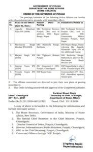 अतः जिन अधिकारियों के आज तबादले किए गए हैं, उनमें आई.पी.एस. जगादले नीलांबरि विजय, हरचरण सिंह भुल्लर, हरजीत सिंह, गौरव तूरा, वत्सला गुप्ता के नाम शामिल हैं।