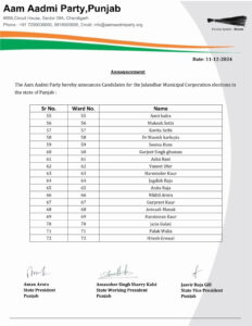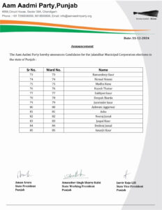 आम आदमी पार्टी की तरफ से जालंधर नगर निगम के लिए अपने 85 उम्मीदवारों की नई सूची जारी की गई है, जिसमें जगदीश राजा और उनकी पत्नी अनीता को टिकट दी गई है। वहीं विभिन्न नेताओं पर भरोसा जताते हुए उन्हें चुनावी मैदान में उतारा गया है। अतः पार्टी ने जिन नेताओं को अपने उम्मीदवार के तौर पर घोषित किया है, उनके नामों की लिस्ट निम्न है।