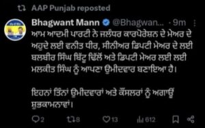 जिसमें विनीत धीर को मेयर, सीनियर डिप्टी मेयर बलबीर सिंह बिट्टू और डिप्टी मेयर के लिए मलकीत सिंह को उम्मीदवार चुना गया। यह ऐलान सीएम भगवंत मान के सोशल मीडिया पेज के जरिए किया गया है। जिसमें तीनों उम्मीदवारों को बधाई भी दी गई।
